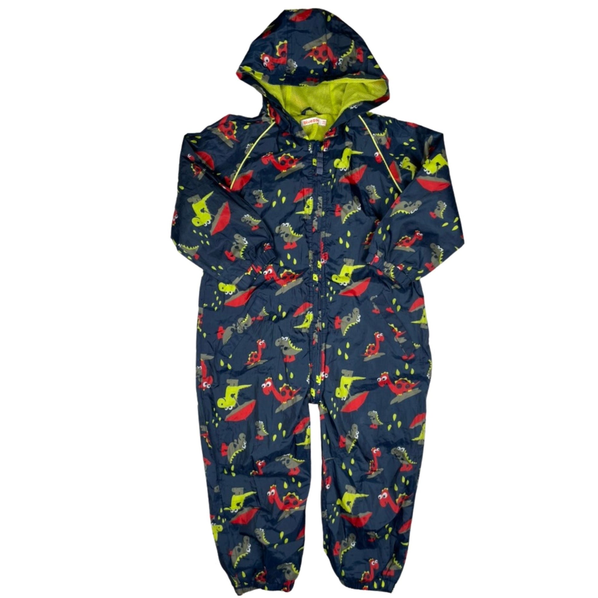 Bunter Kinder-Overall mit fröhlichem Dinosaurier-Muster auf dunkelblauem Hintergrund. Mit Kapuze, durchgehendem Reißverschluss und elastischen Bündchen. Innen mit atmungsaktiver Netzfütterung in Neongrün.