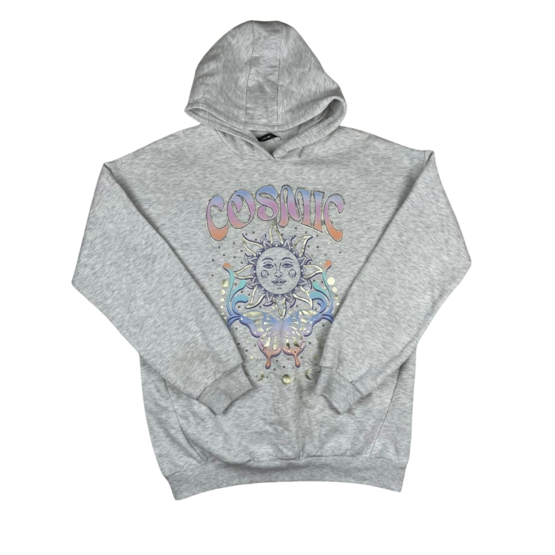 Weicher, grauer Kapuzenpullover mit „COSMIC“-Print und Sonnengrafik. Innen kuschelig angeraut für extra Komfort.