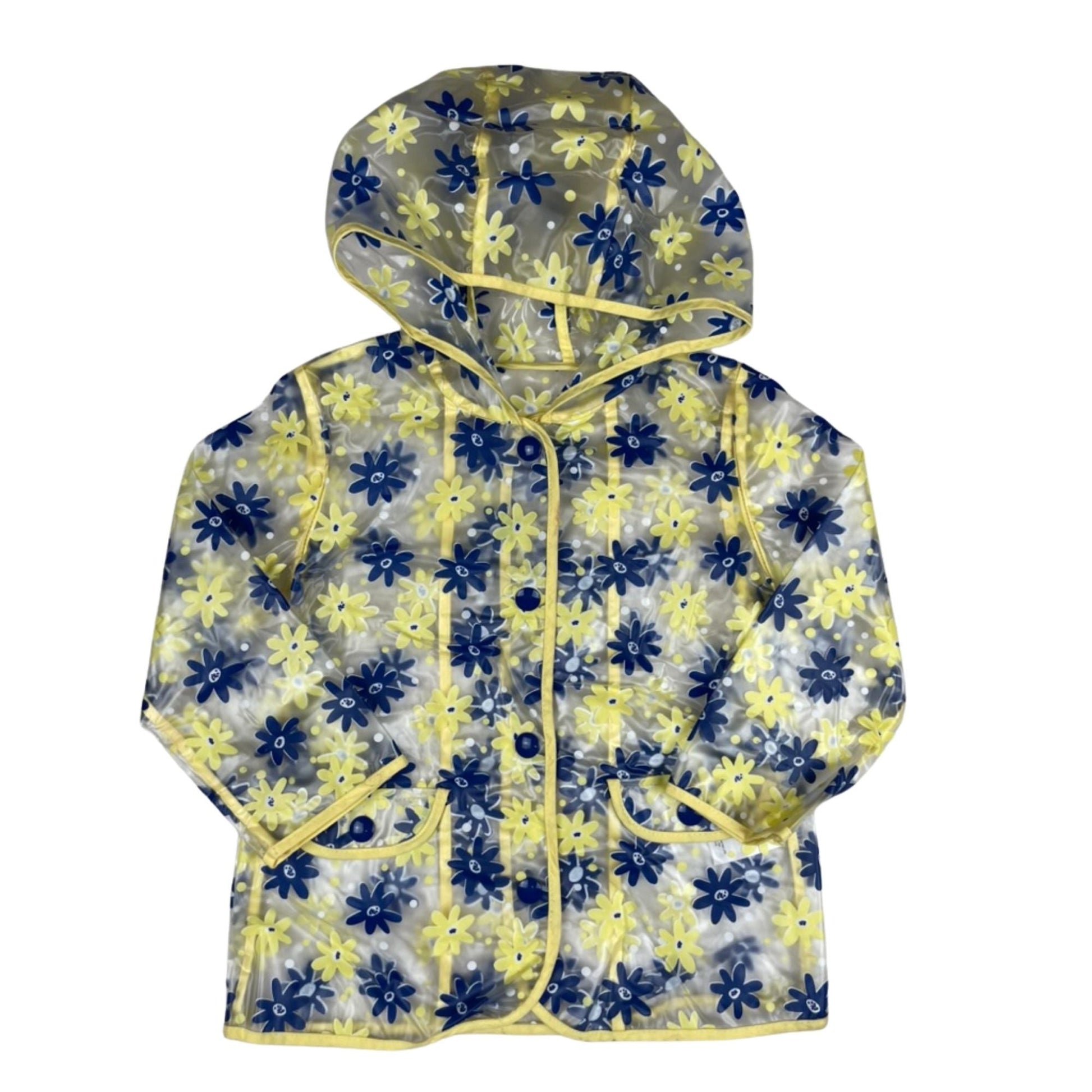 Zauberhafte Regenjacke in transparentem Design mit blauen und gelben Blumen sowie gelbem Einfassband. Mit Kapuze, Knöpfen und aufgesetzten Taschen.