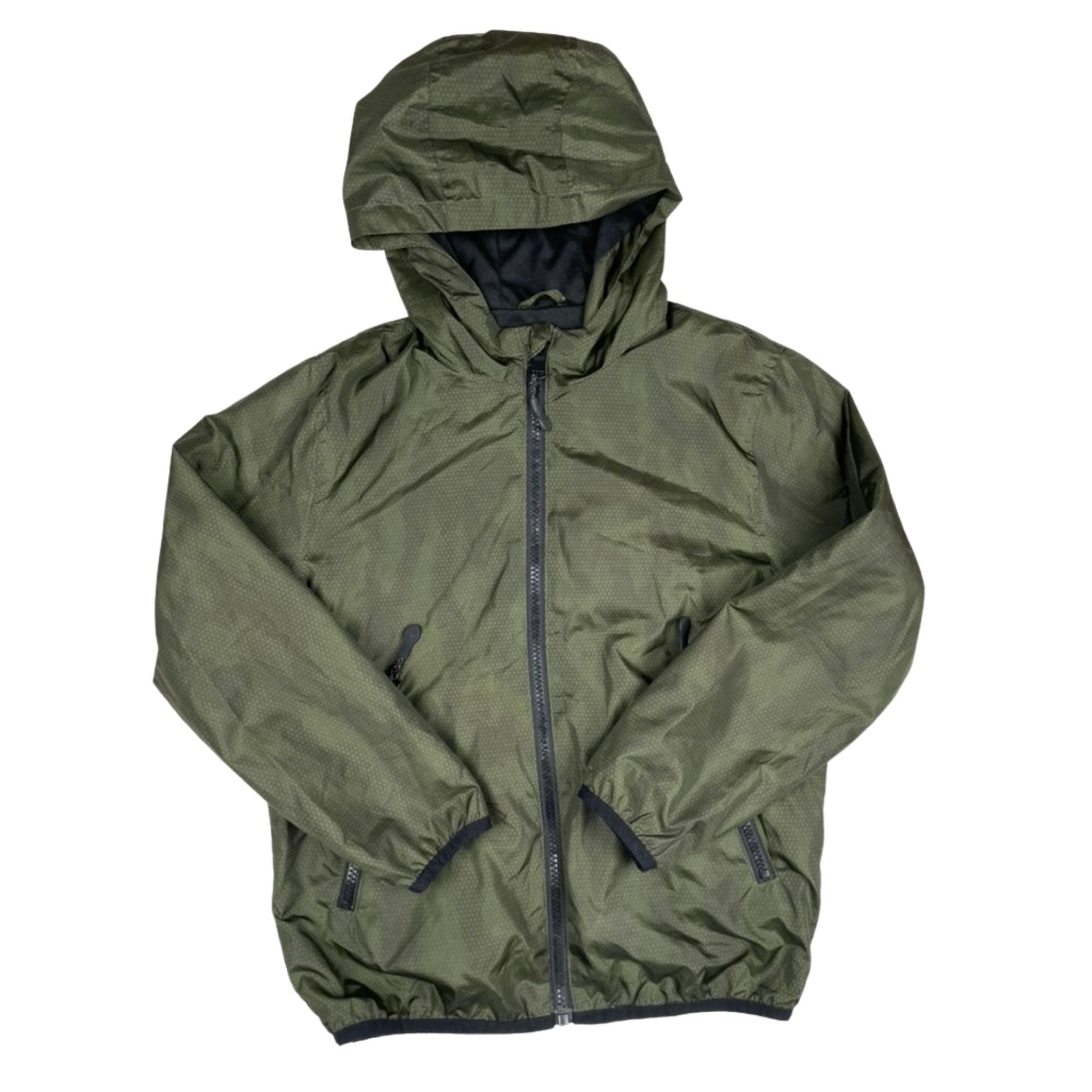 Leichte Regenjacke in Khakigrün mit Kapuze. Die Jacke ist wasserabweisend und maschinenwaschbar.